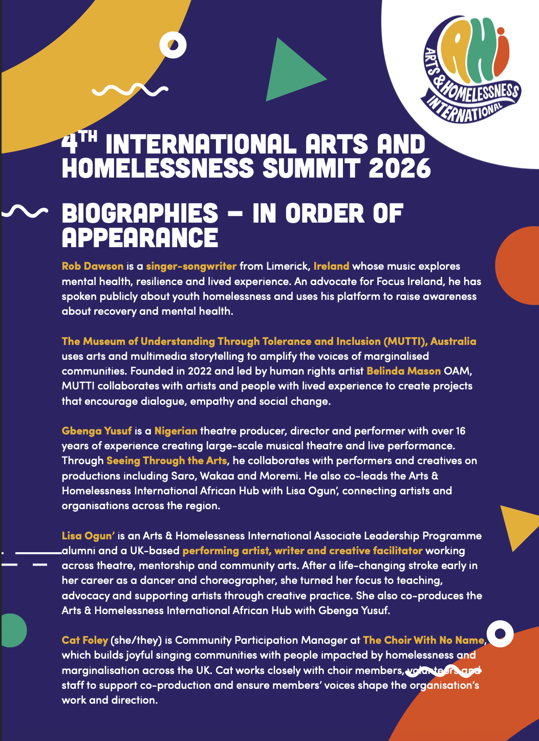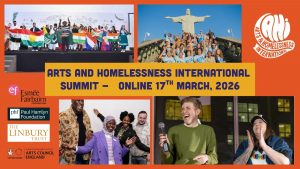 We are very happy to announce that the 4th International Arts and Homelessness Summit will take place on 17th March 2026. This event will be online and, this year, themed around the new arts and homelessness sector Quality Framework – illustrating projects and artists that excel in creating work that joyful, accessible, co-created and ethical. The programme takes place between 10.30am and 6.00pm (UK time) and includes: